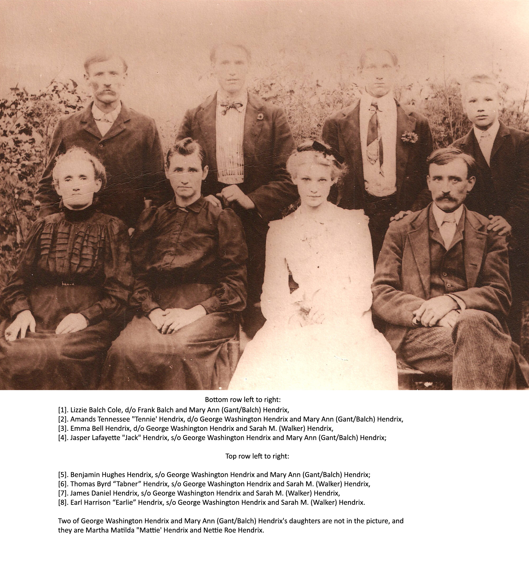 George Washington Hendrix and Mary A.B. (Gant/ Balch) Hendrix had five children. Two daughters are not in the above picture; Martha "Mattie" Hendrix, and Netter Roe Hendrix.