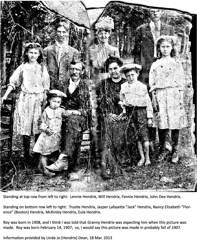 Theodore Huron "Trusty" Hendrix, Jasper Lafayette "Jack" Hendrix, Nancy Elizabeth "Florence" Hendrix. McKinley H. Hendrix, Eula Jane HendrixNancy Elizabeth "Florence" (Boston) Hendrix