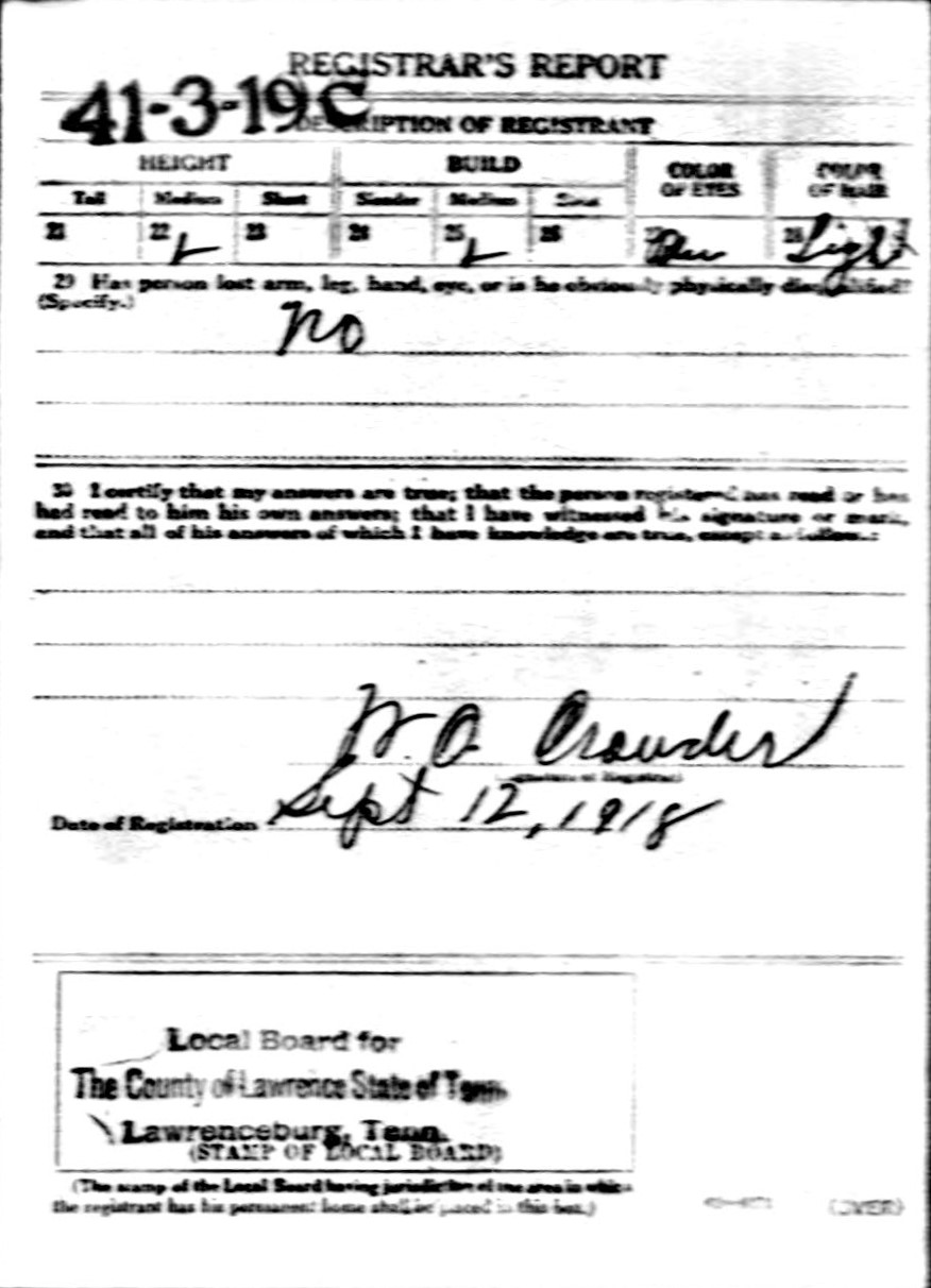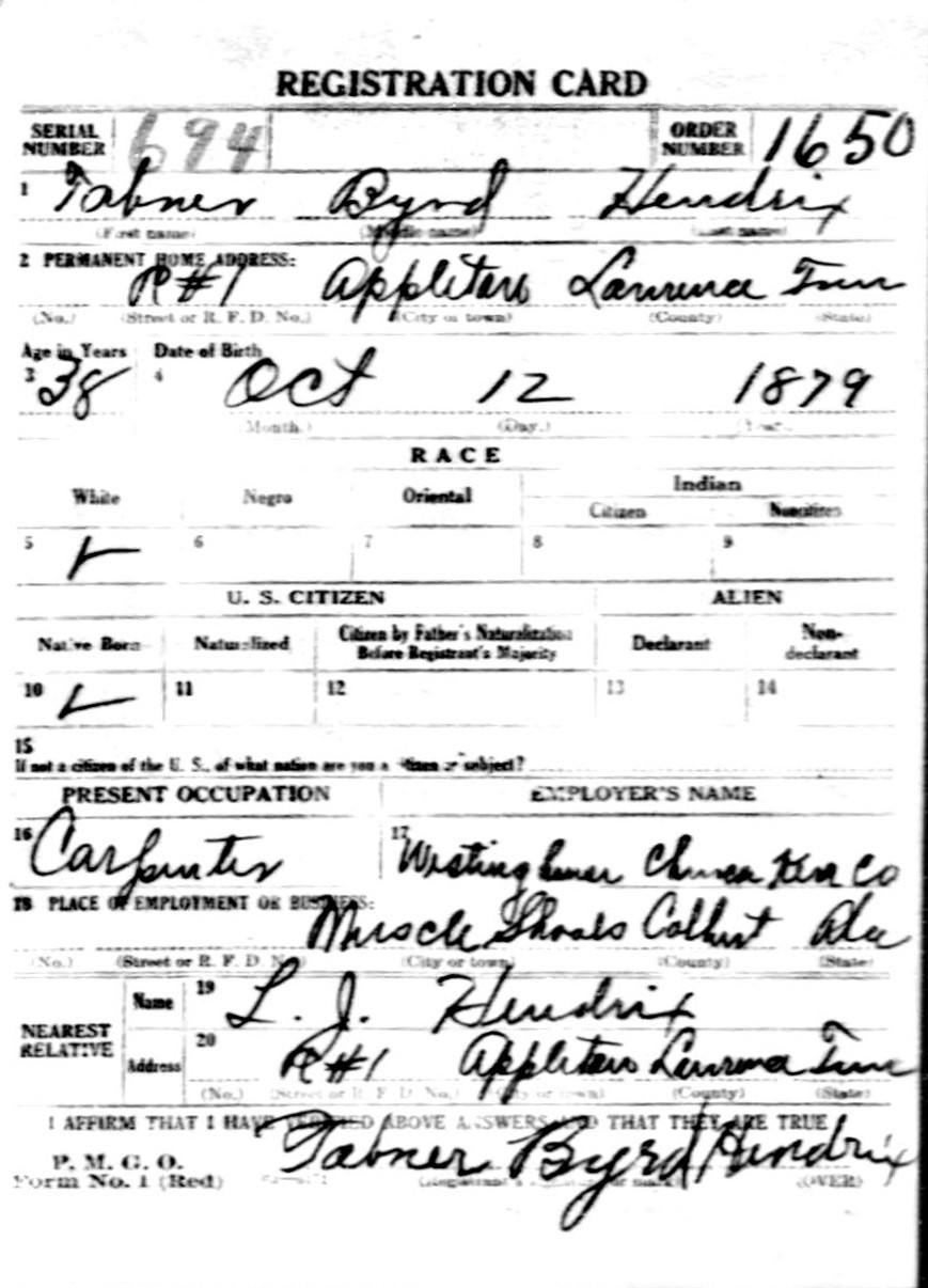 Thomas Byrd "Tabner" Hendrix's World War I Draft Card