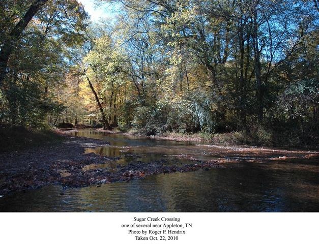 During the Civil War, the last battle in Tennessee was fought on Sugar Creek, north of Appleton. This was the only battle of any significance fought in Lawrence County during the bloody four years of war. * In 1887, George Washington Hendrix, my great-great-grandfather, bought and moved to a farm north of Dobbins Cemetery just before you cross Sugar Creek. I have been told part of the battle occurred on this farm. {LJHD}