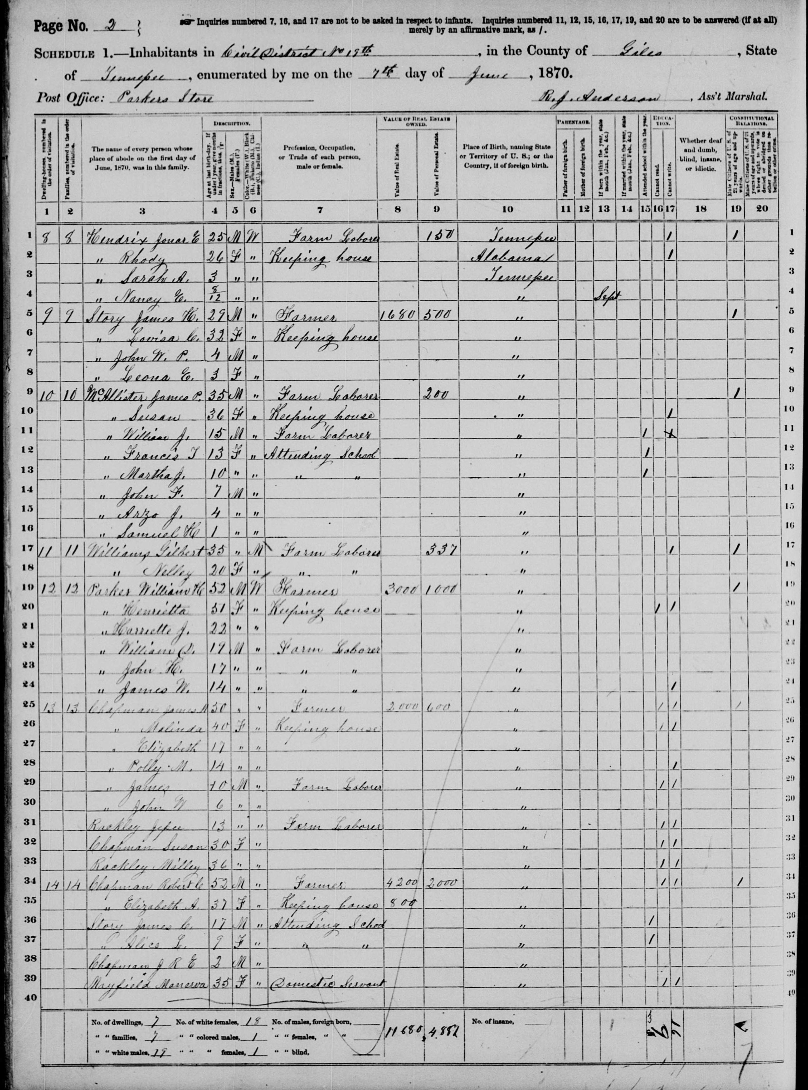 The 1870 Census for the Post Office at Parker Store, Giles County, Tennessee, dated June 7, 1870,