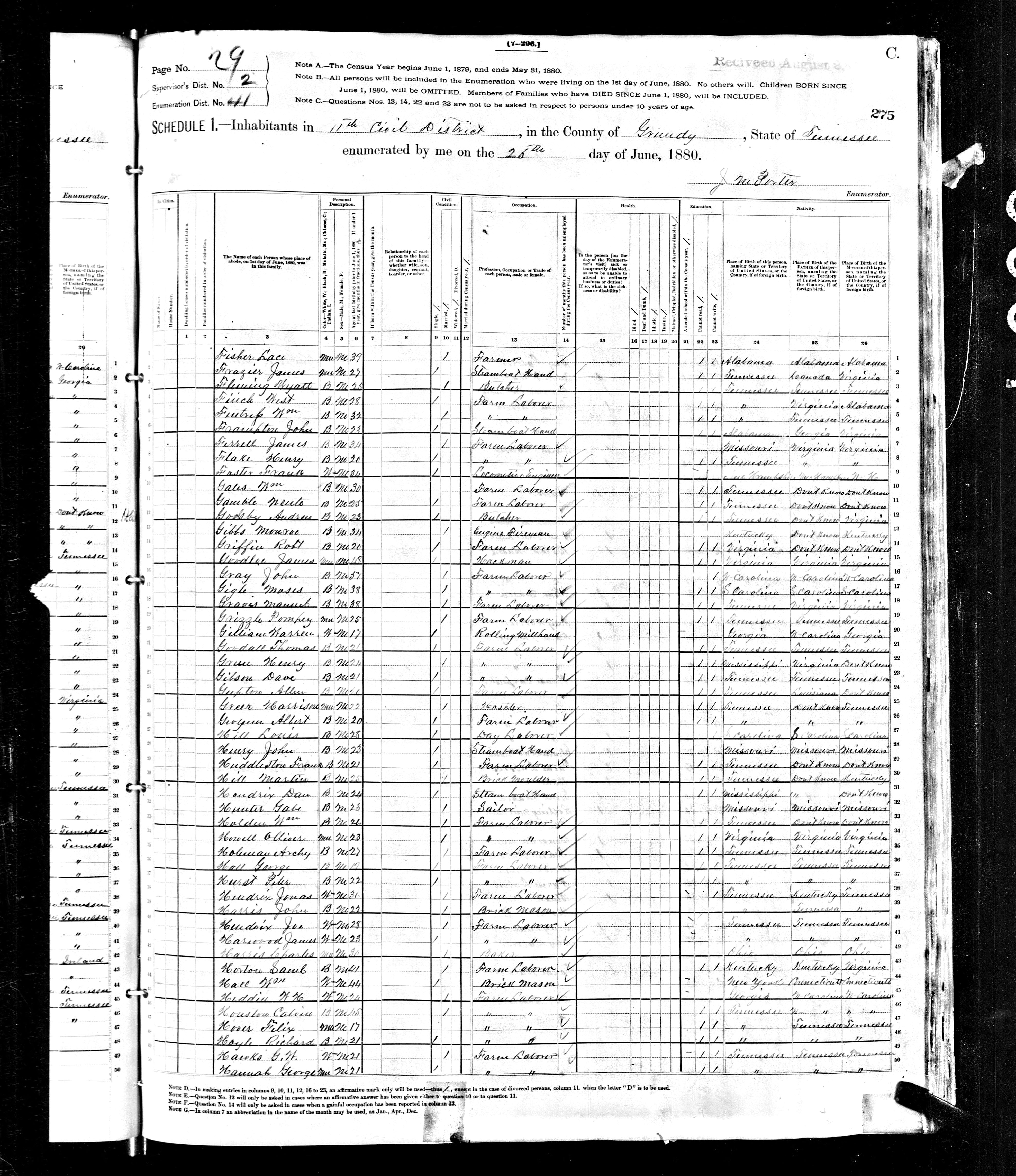The 1880 Census of the 11th Civil District, Grundy County, Tennessee, dated 12 June 1880, which is the census of the inmates at the prison at Tracy City, shows Jonas Hendrix as white male, age 36, birthplace Tennessee. This census also shows that there were two other men, Dan Hendrix (Black) and Joe Hendrix (White), in the prison at the same time as Jonas.