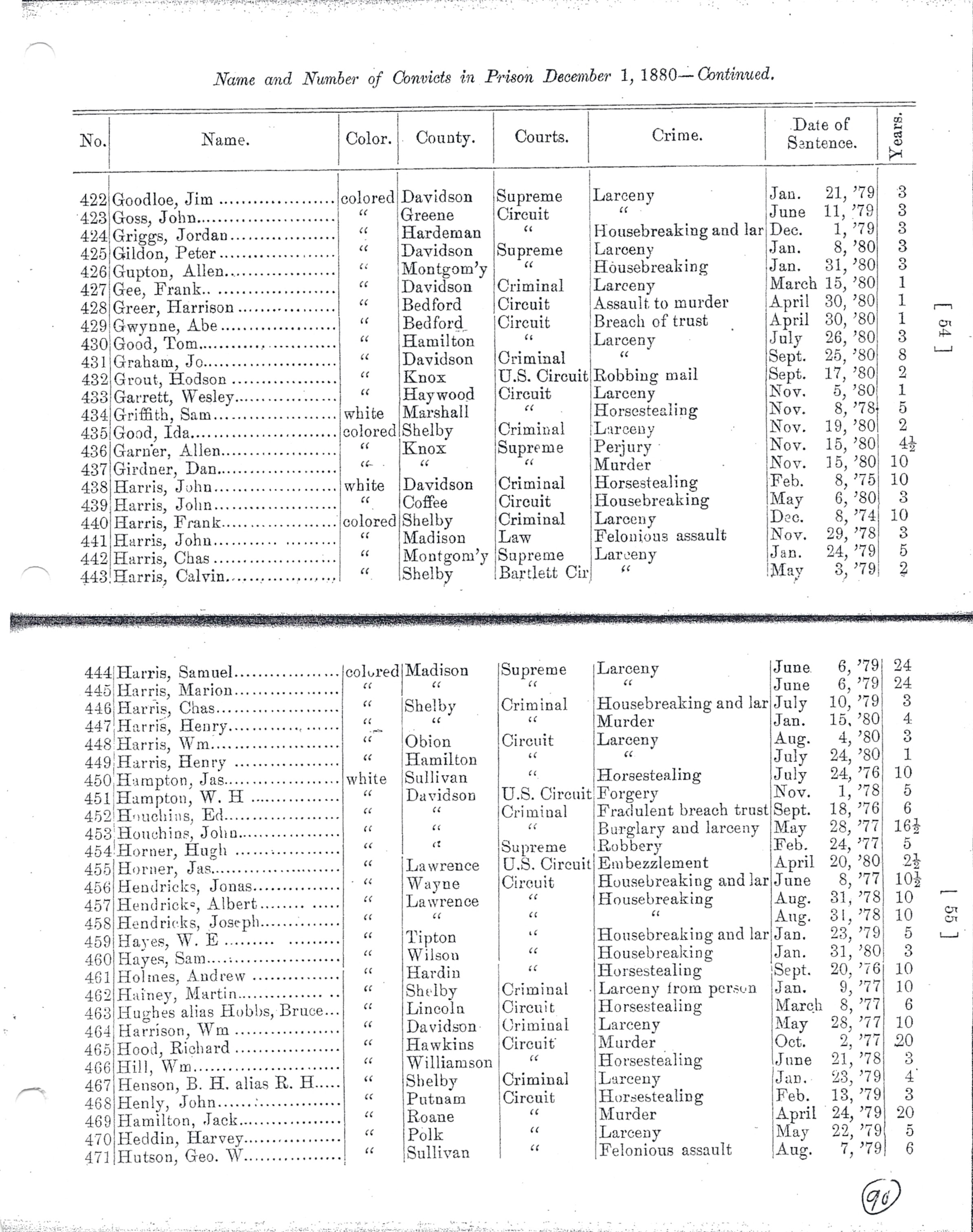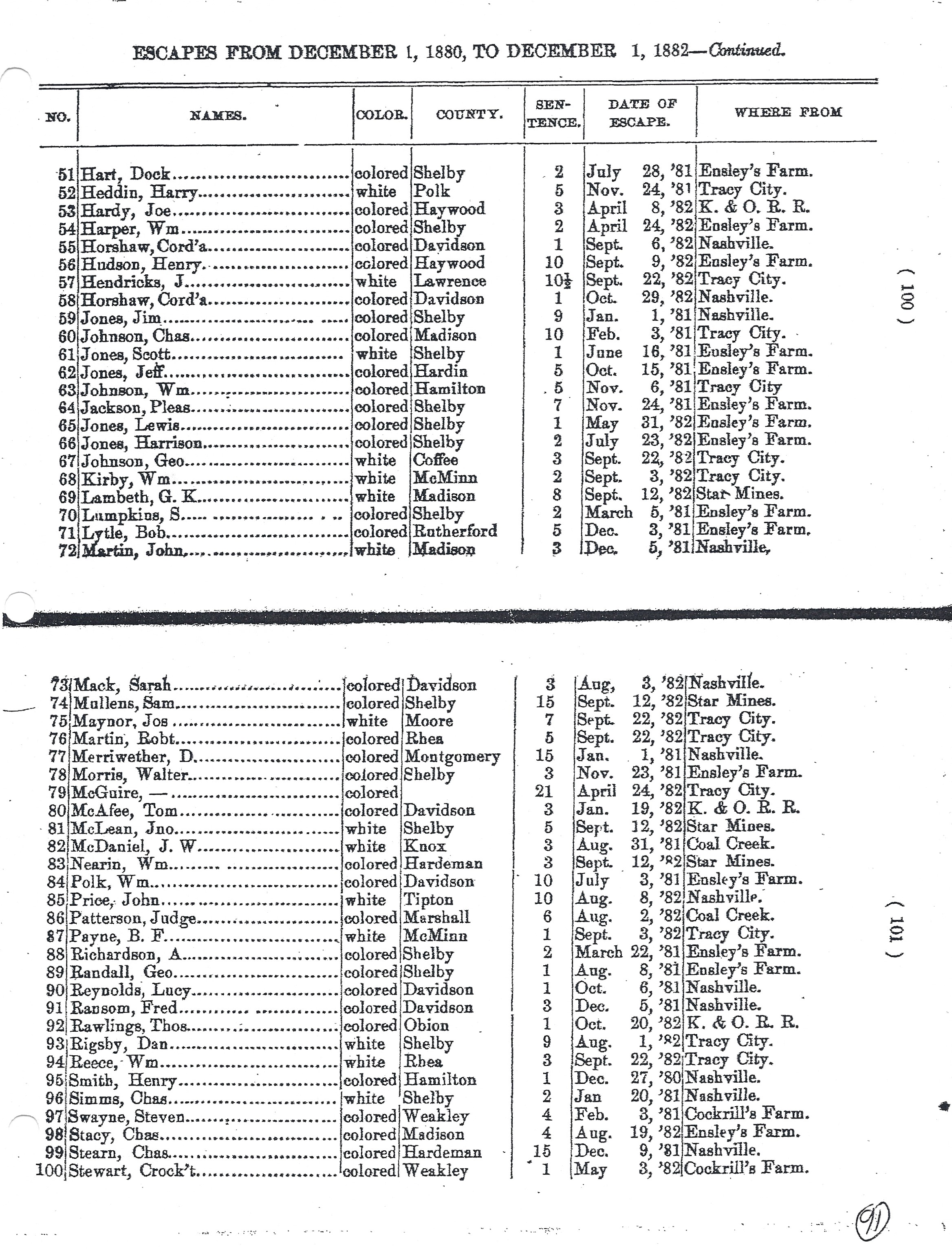 Jonas Hendricks escaped from the Tracy City Prison, Grundy County, Tennessee on Sept. 22, 1882, which has been confirmed Biennial Report of the Superintendent of Prisons to the 43rd General Assembly of the state of Tennessee, December, 1882.